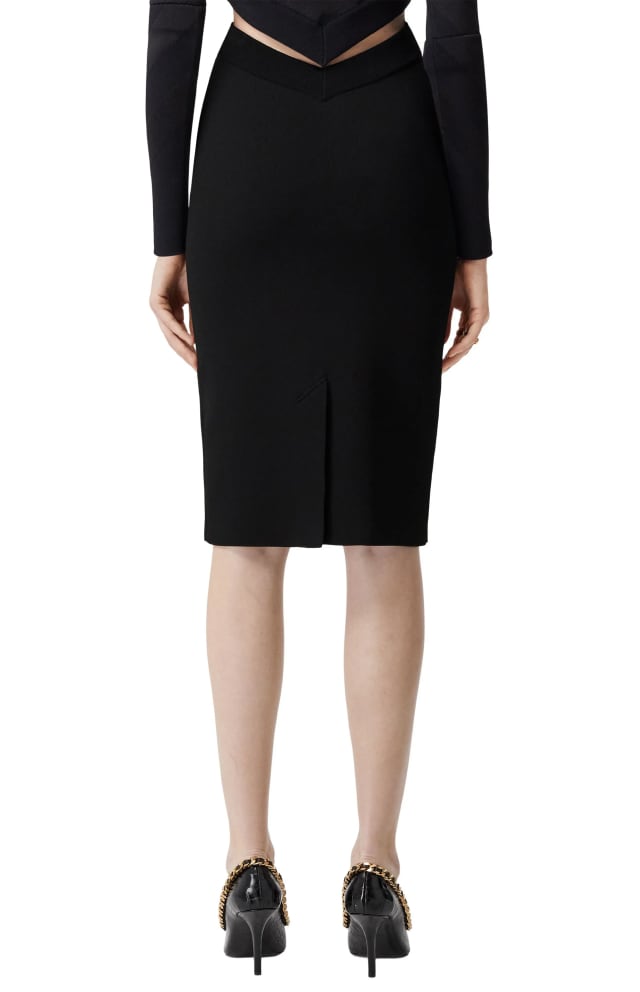 The season’s chevron theme carries over to this knit pencil skirt topped with a front-and-back V-waist.